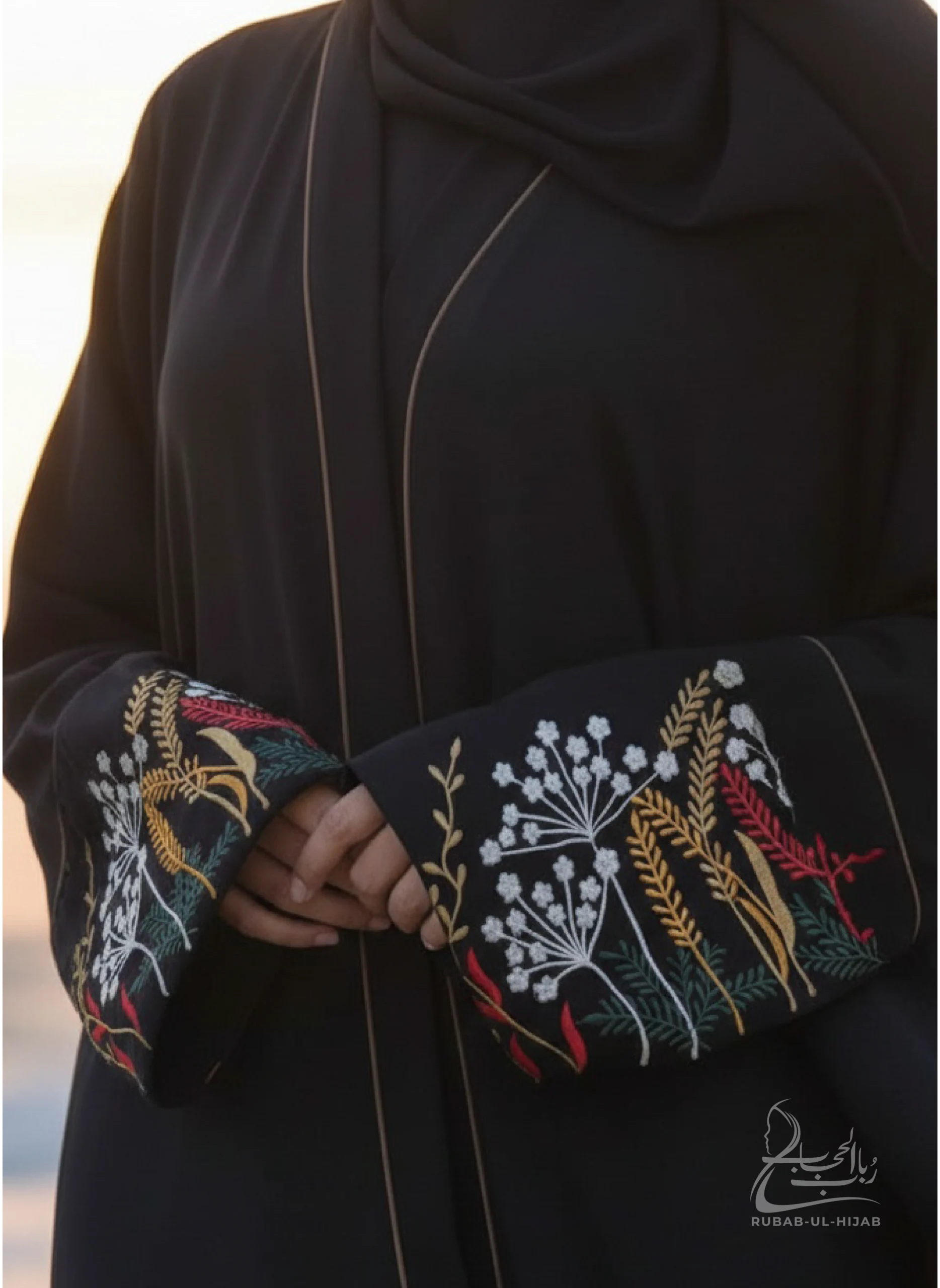 The defining feature of this abaya is the magnificent, contrasting embroidery adorning the wide cuffs. Inspired by nature’s detailed beauty, the intricate floral and feather-like patterns add a rich, colorful burst to the deep black canvas. A delicate piped trim runs along the front opening and cuffs, subtly enhancing the elegant, open-front design.