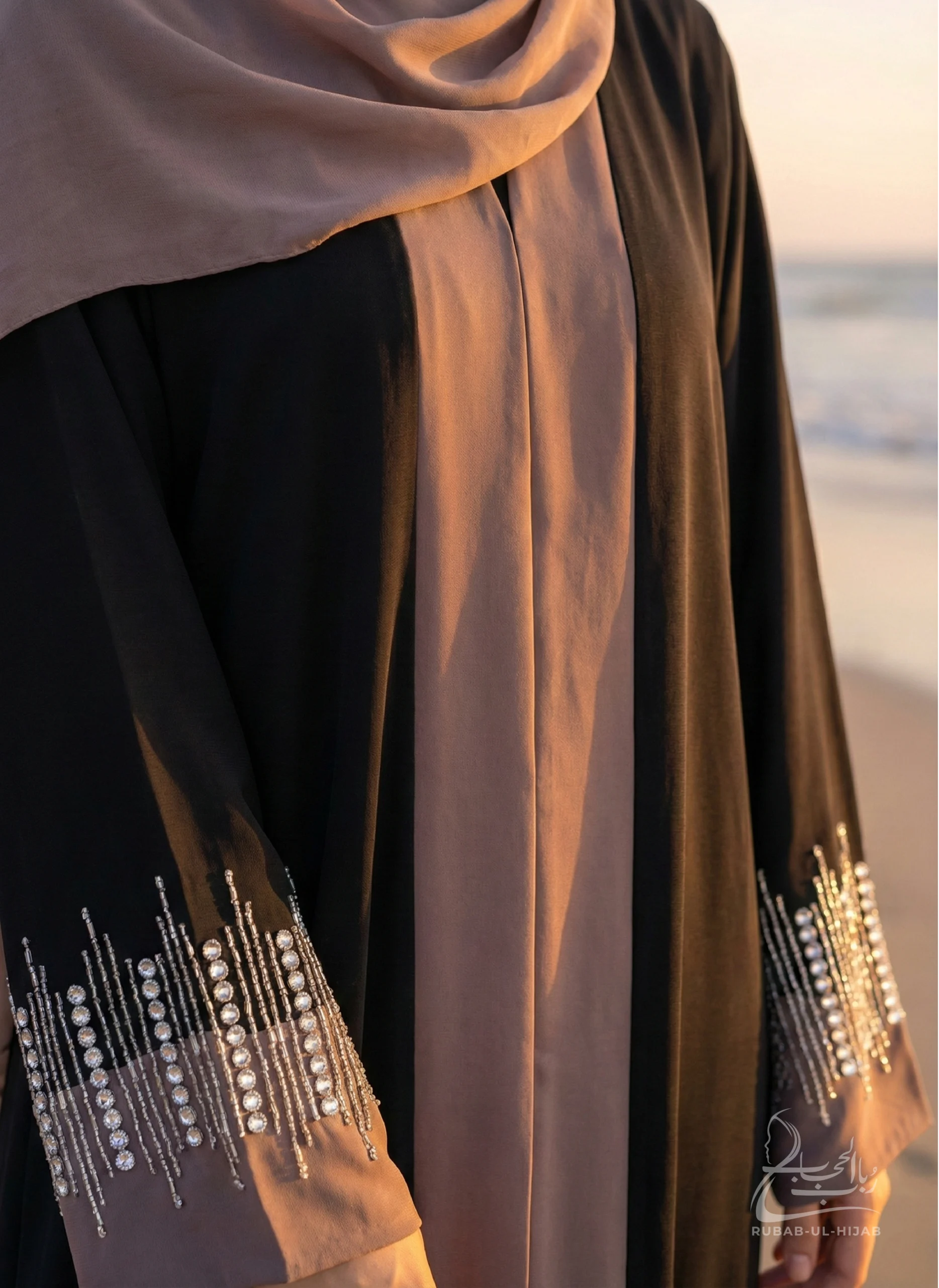 Make a truly glamorous statement with The Galaxy Cuff. This breathtaking Two-Tone Abaya combines smooth, premium Luxury Nida Fabric with exquisite Handmade Stone Embellishment for an unforgettable look. The elegant color-block design, featuring a central mauve/grey panel, dramatically frames the stunning beadwork.