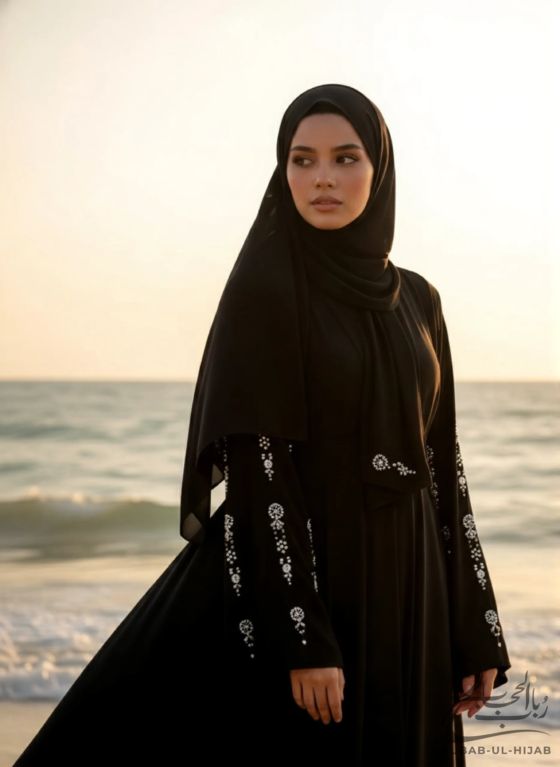 Experience the pinnacle of luxury modest fashion with The Lunar Bloom Abaya. This breathtaking piece is defined by its impeccable handmade craftsmanship, featuring elaborate silver/white stitching that elegantly “blooms” across the fitted cuffs and bodice band. This intricate detailing creates a radiant contrast against the rich, deep black fabric.