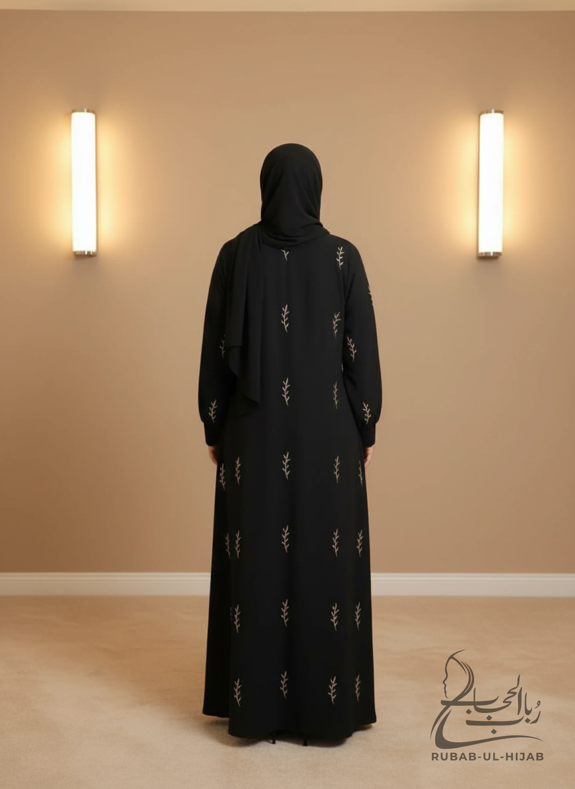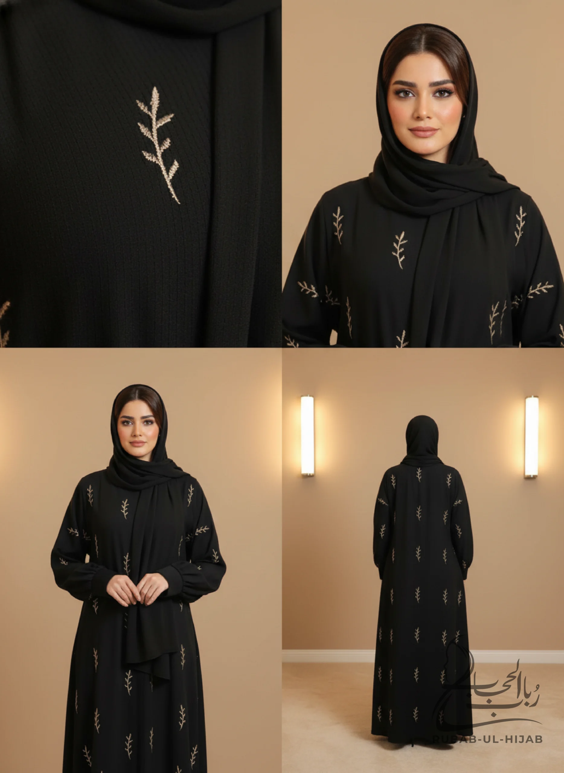 • Gilded Vertical Motif: The garment is highlighted by fine Gold Embroidery Abaya in a Vertical Motif Design that resembles delicate, stylized leaves or fronds. This “trace” of gold elongates the silhouette and offers a touch of opulent sparkle.