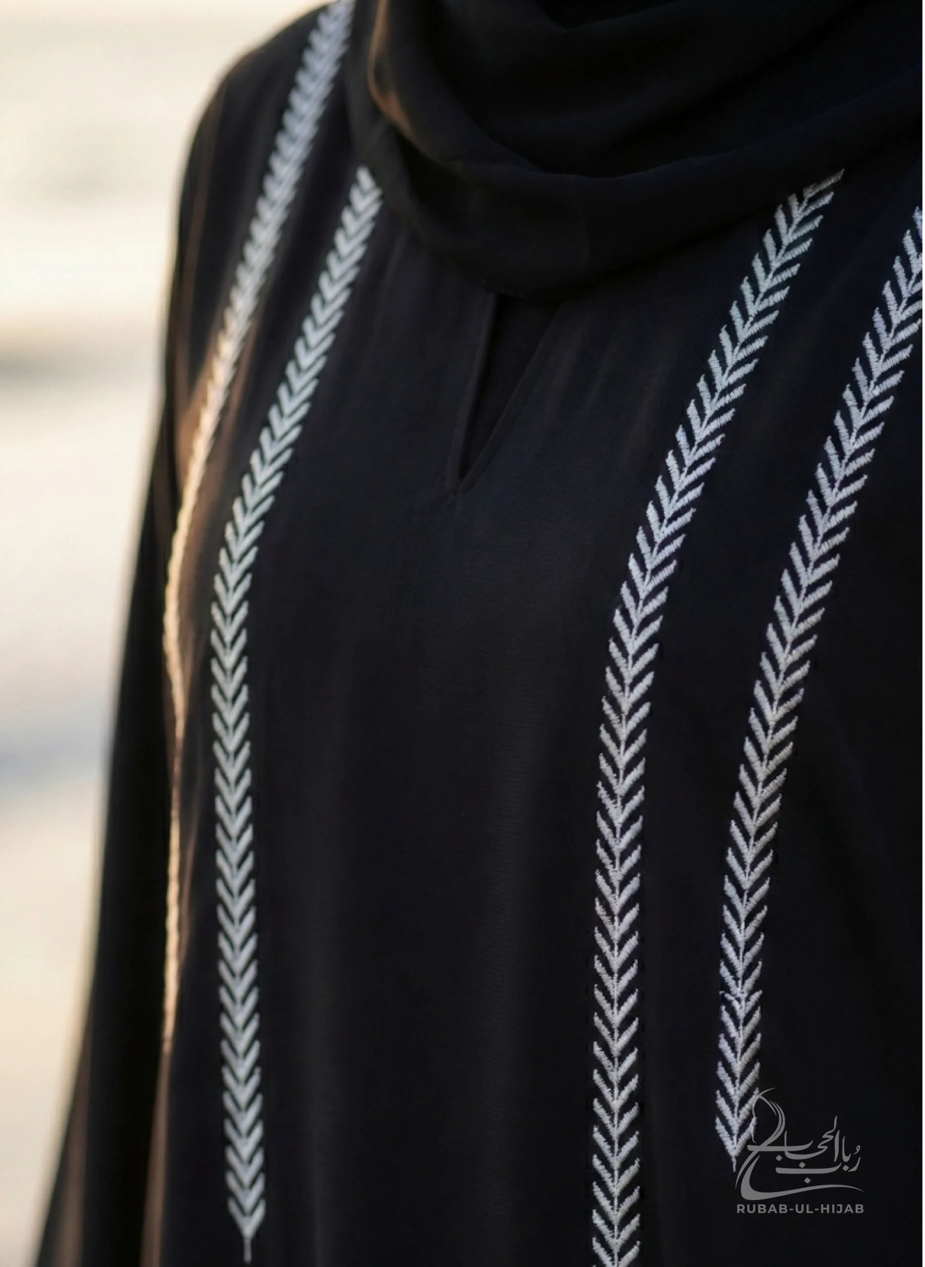 The defining feature is the intricate silver embroidery running in strong, parallel lines down the front panel and gracefully trimming the cuffs. This striking linear pattern, or “crest,” creates a lengthening effect and adds a touch of regal structure to the classic black abaya silhouette.